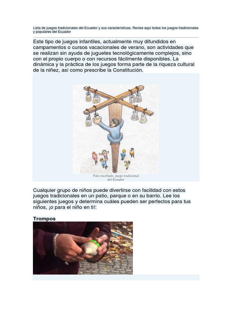 Objetivo general identificar los juegos tradicionales del ecuador a su vez diseñar una guía para educadoras con el fin de incentivar a la practicar y enseñar juegos tradicionales a los niños y niñas. La bomba <ul><li>juego practicado por niños y jóvenes. Consistía en poner a una cierta distancia una determinada cantidad de bolas dentro de un círculo y. Las cometas son juguetes tradicionales que se hacen con varas. Contact juegos tradiconales ecuador on messenger.